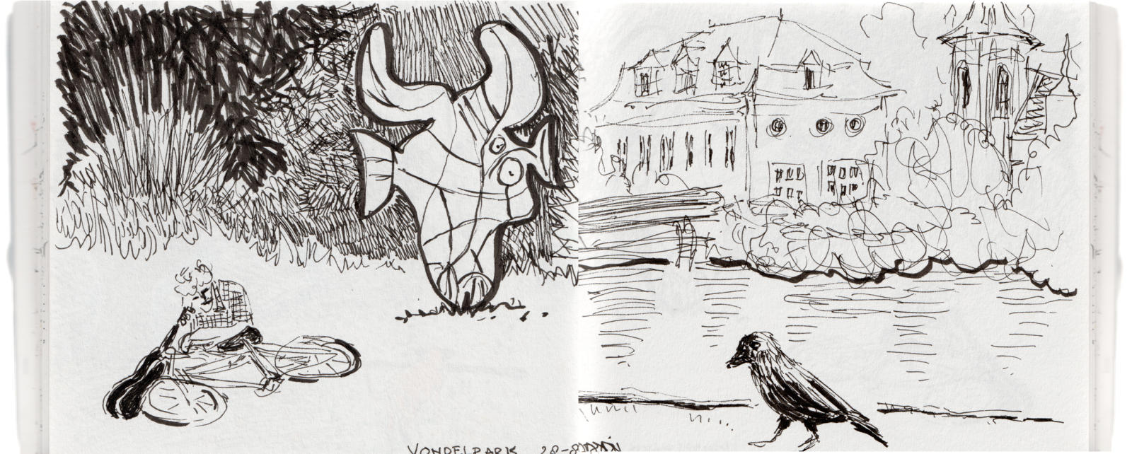 Neem zelf een schetsboekje mee met een stevige kaft (A5/A4, net wat jijzelf fijn vindt) en wat verschillende tekenmaterialen (potlood, dunne en dikke fineliner, wit potlood, witte gelpen) of bestel van te voren een pakketje met materialen bij mij. Dat kun je dan op de dag zelf met een tikkie voor ca. 7 euro afrekenen, stuur me dan even een mailtje marisa.stoffers@gmail.com.